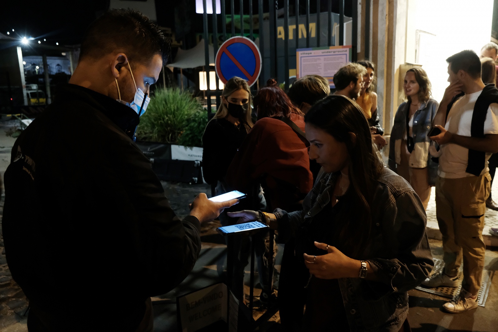 Os grupos vão crescendo à porta do Village. Bebe-se pelo gargalo da garrafa de vinho ou de cerveja, espera-se que chegue mais um amigo também, enquanto começa a formar-se a fila para mostrarmos o certificado e o cartão de cidadão. Só há uma pessoa a controlar isto tudo e é manifestamente pouco.