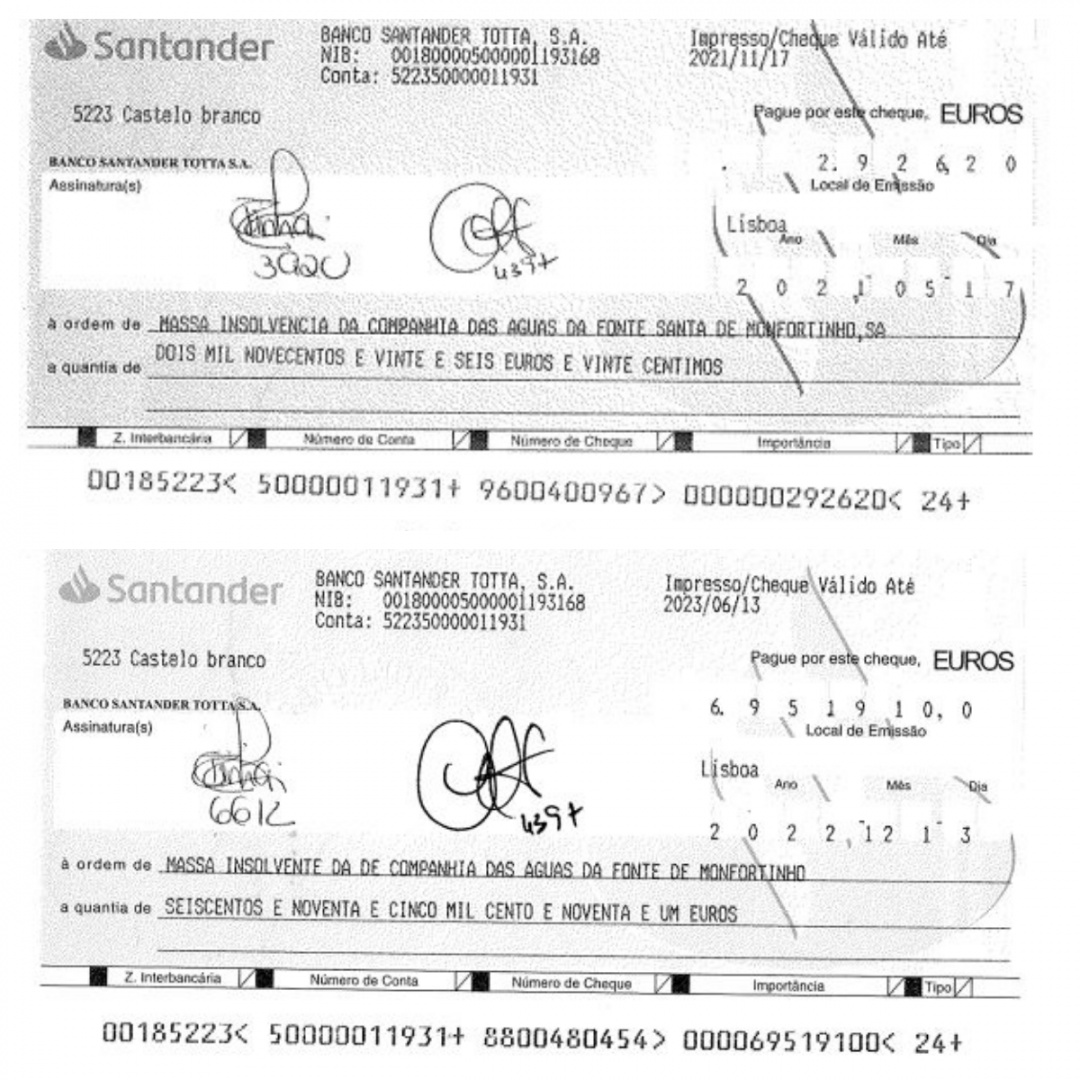 Curiosamente, porém, a Vestein, em maio de 2021, ou seja ainda antes de, formalmente, passar para a esfera de Ricardo Leitão Machado, apresentou uma proposta ao Tribunal do Fundão para a compra de um terreno, que também fazia parte dos bens da Companhia de Águas da Fonte Santa de Monfortinho. Para sinalizar a compra, a sociedade, que se apresentou a concurso ainda com o cidadão espanhol Jaime Perinat de Romaní como beneficiário efetivo, entregou um cheque de €2 926 em tudo semelhante ao apresentado, em 2022, pela Concrete Velvet: a mesma agência, Castelo Branco, o mesmo número de conta e assinaturas em tudo idênticas (ver imagens nestas páginas).