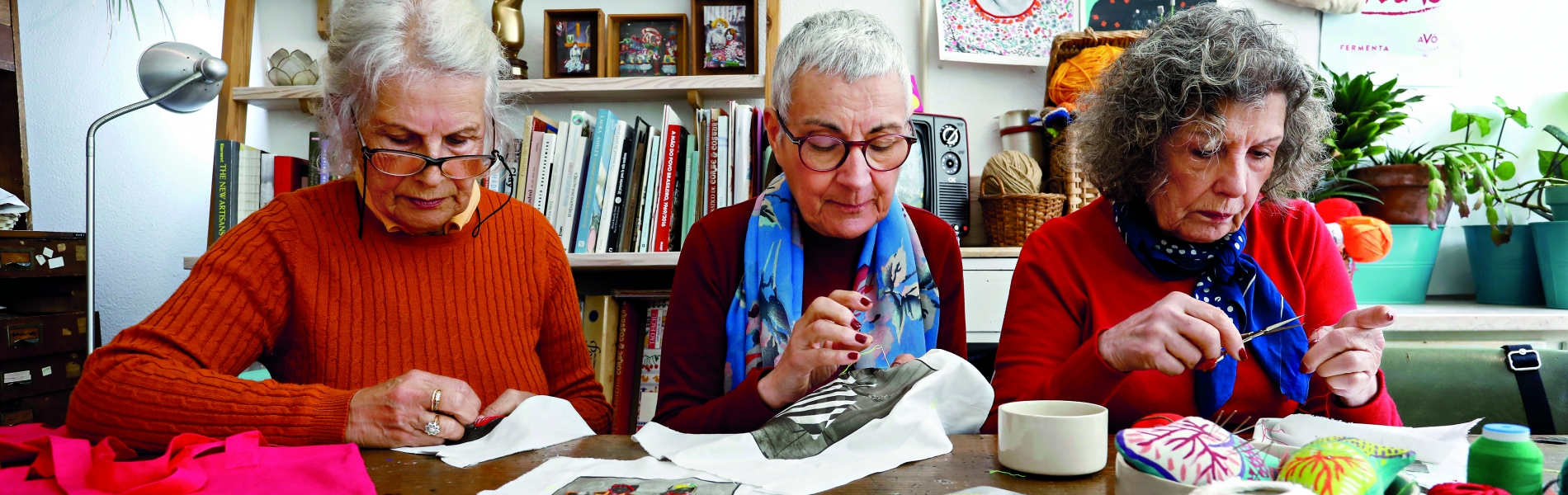 Em cima da grande mesa corrida de madeira, o epicentro deste atelier de design para pessoas com mais de 60 anos, encontram-se pedaços de tecido com imagens tipicamente japonesas. A debruar os contornos dos desenhos, coloridas linhas de bordar dão um toque personalizado ao trabalho artístico. Estas são algumas das 150 peças, ultimadas nas vésperas da partida, que seguiram viagem até ao Japão, nas malas dos dois mentores do projeto A Avó Veio Trabalhar e de três avós, que é como carinhosamente chamam a quem aqui escolhe passar os dias.