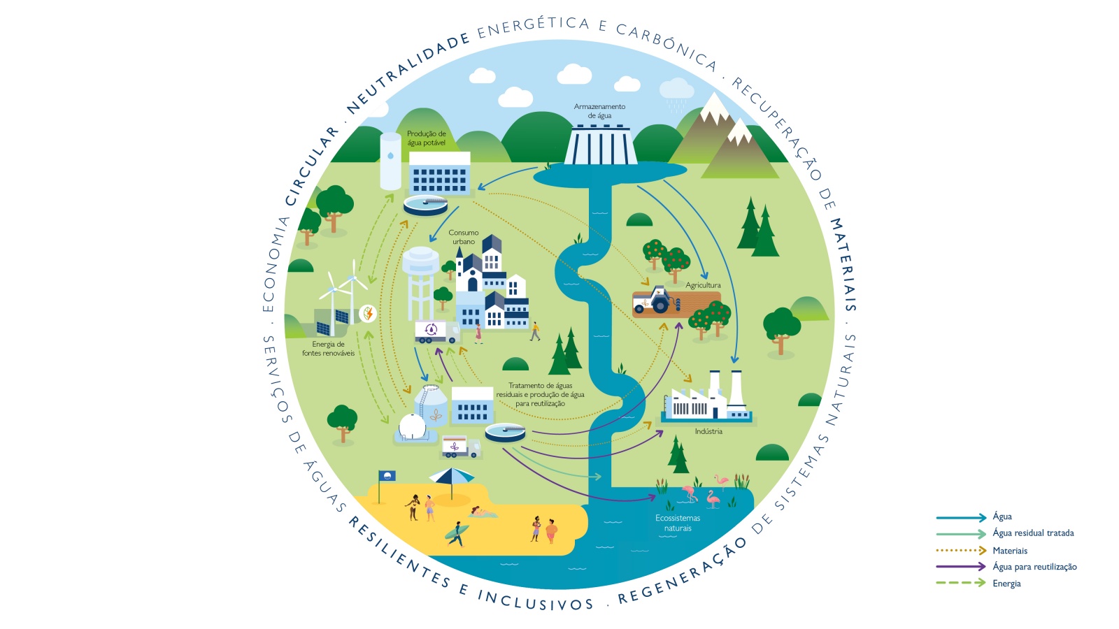 Incorporar os desafios da economia circular na gestão do ciclo urbano da água tem impactos positivos quer ao nível do consumo de recursos naturais quer da redução de resíduos produzidos. O que se verifica é que a água, um recurso por si só, se transforma, nas várias etapas da circularidade, em fonte de novos recursos, sendo um elo crucial num outro ciclo: o da inovação rumo a um futuro mais sustentável.