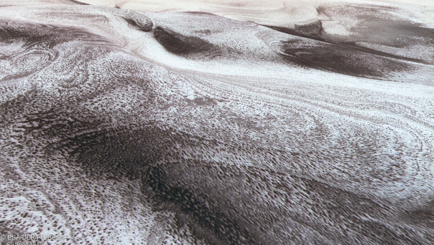Imagens captadas pela sonda Mars Express da Agência Espacial Europeia (ESA) mostram a região de Australe Scopuli, em Marte, coberta em gelo de dióxido de carbono e poeiras, no polo sul do planeta.