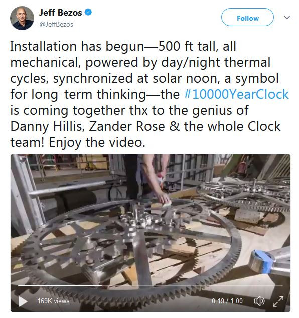 Jeff Bezos escreveu no Twitter que começou a construção de um relógio que mede 152 metros de altura, completamente mecânico e alimentado a ciclos termais diurnos e noturnos, sincronizado e que é um «símbolo para o pensamento a longo prazo».