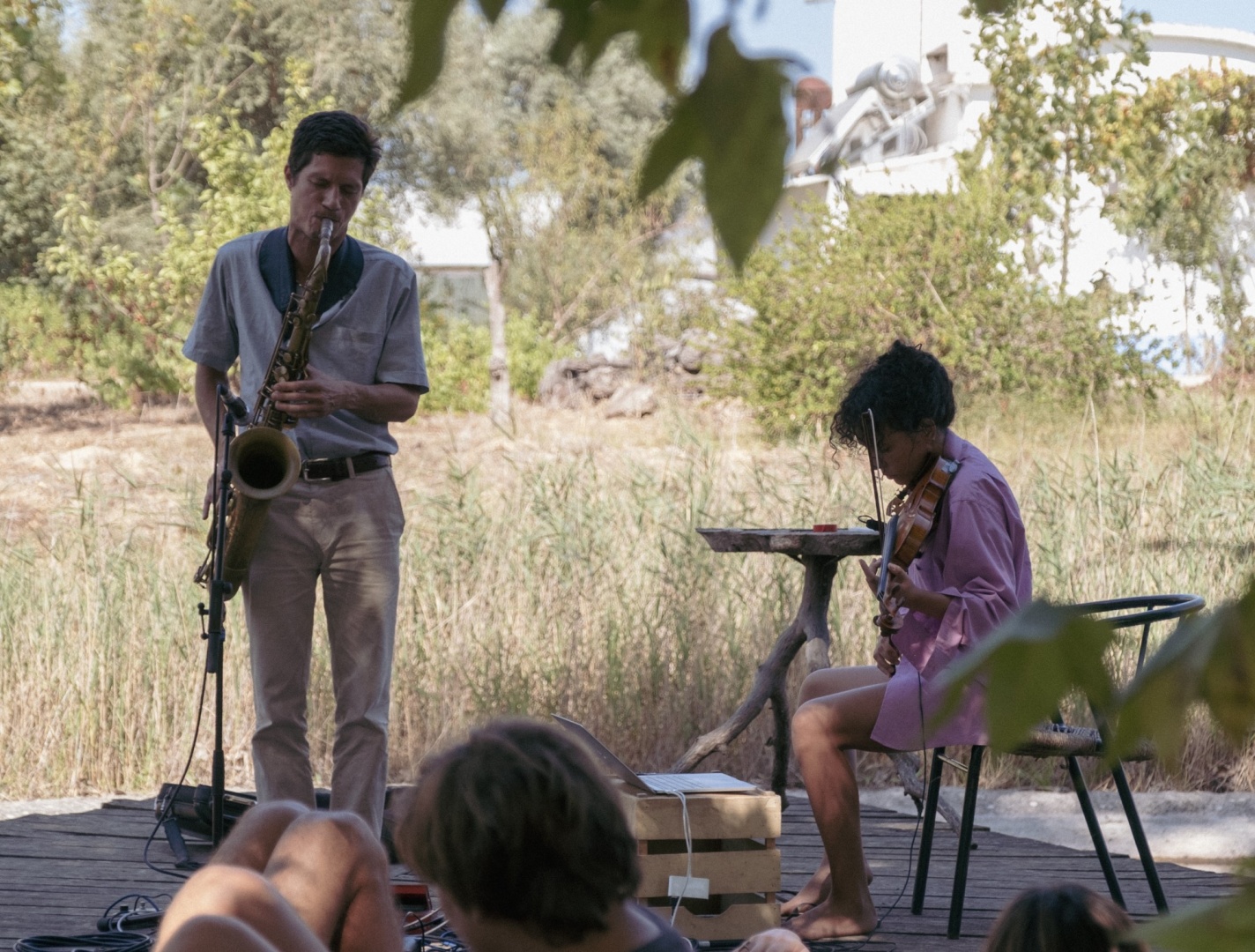 Envoltos pela paisagem do montado alentejano, Pedro e Adriana fizeram soar, respetivamente no saxofone e no violino, notas de uma “composição improvisada”, nas palavras dos artistas, que se misturaram, lentamente, com os sons reais da natureza e com uma gravação de rumor de pássaros.