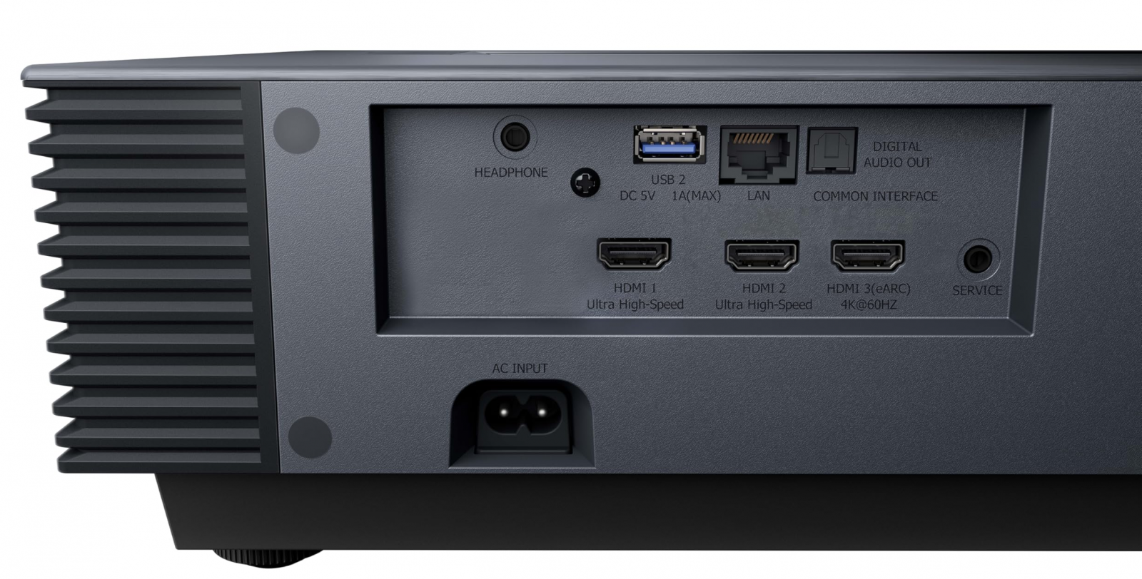 Há muita conectividade. Incluindo porta de rede, portas HDMI de alta velocidade e USB. Graças ao Wi-Fi integrado e ao sistema operativo Smart TV, é possível usar este projetor de modo isolado, sem qualquer fonte externa