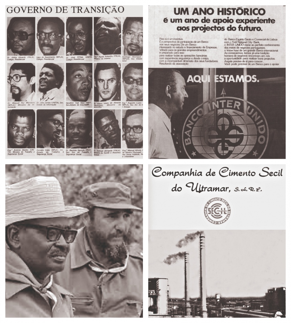 Os anos duros Agostinho Neto com Fidel Castro (à esquerda); o governo de transição (em cima, à esquerda) e duas imagens publicitárias da Secil e do Banco Inter Unido (à direita)