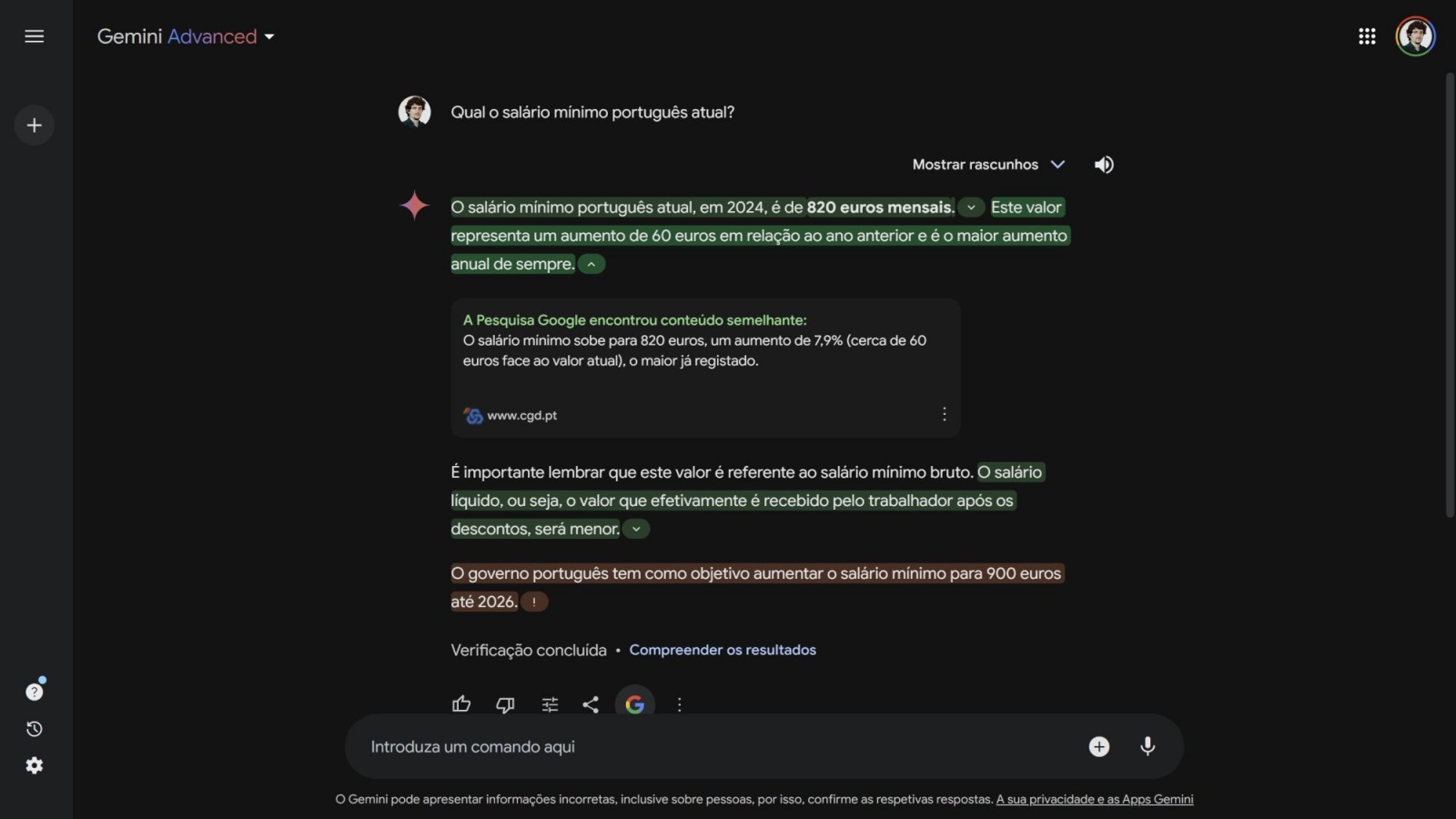 O Google Gemini leva vantagem sobre o ChatGPT numa área importante. Em todas as respostas, o utilizador pode carregar no ícone da Google para verificar a informação das respostas. Na prática, o sistema vai à web procurar a informação gerada pelo Gemini e assinalará a verde as correspondências positivas, a amarelo aquelas que precisam de verificação e a vermelho as que são falsas (as chamadas ‘alucinações’).