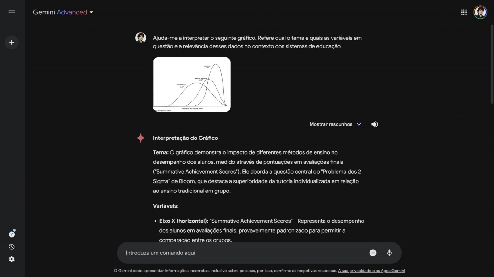Por vezes, quando estamos a estudar sozinhos, surgem-nos informações visuais que temos dificuldades em interpretar. Mapas, gráficos, tabelas ou diagramas… Agora, as versões mais avançadas dos sistemas de Inteligência Artificial também são capazes de processar a informação que existe numa imagem. Use a resposta gerada como um ponto de partida para fazer a sua própria interpretação. Aqui o maior segredo está, em boa verdade, na qualidade da imagem, e depois é deixar o modelo de IA tratar do resto. “Ajuda-me a interpretar o seguinte gráfico. Refere qual o tema e quais as variáveis em questão e a relevância desses dados no contexto de [inserir motivo do estudo]”.