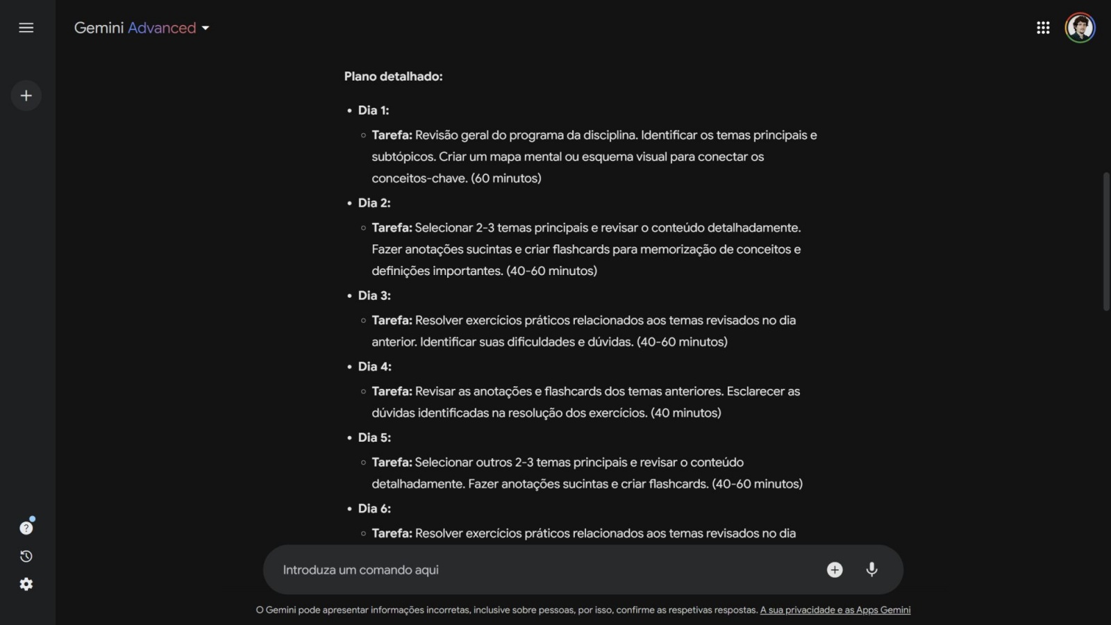 Esta é, garantidamente, uma das áreas nas quais os assistentes digitais mais brilham, pois fazem em segundos uma planificação que, se feita de forma manual, seria muito mais demorada. O nosso conselho é que seja detalhado e realista nas informações que passa ao assistente sobre os prazos. Fica um exemplo que pode depois adaptar às suas necessidades: “Vou ter um exame de Sociologia no dia 9 de novembro, da parte da manhã. Elabora um plano de estudo de dez dias apenas e que inclua entre 40 a 60 minutos de estudo por dia, não inclua domingos e feriados, e tenha em consideração que tenho aulas todos os dias das 9h às 13h e que às terças e quintas ainda preciso de duas horas para os treinos de ténis de mesa. Detalha ainda que tarefa devo fazer em cada dia de estudo para que seja o mais completo e abrangente possível“.