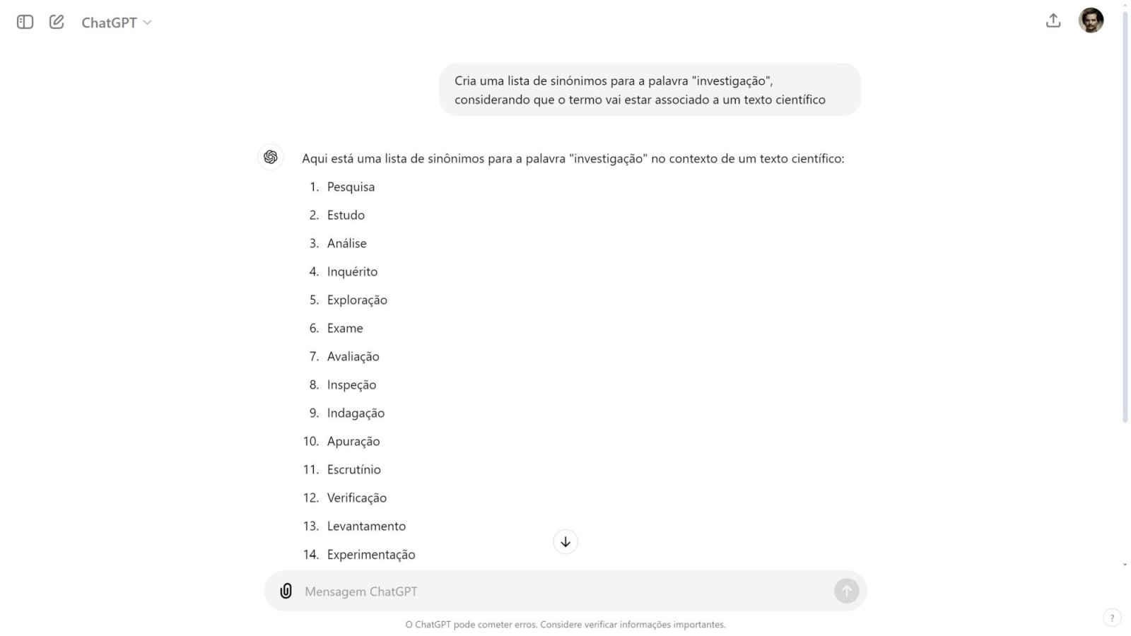 Ainda relacionado com a entrega de trabalhos, os assistentes também podem ser uma ajuda preciosa a melhorar a qualidade da escrita. Em vez de usar os mesmos termos de forma repetida, peça aos assistentes por alternativas. “Cria uma lista de sinónimos para a palavra ‘investigação’, considerando que o termo vai estar associado a um texto científico”. Num piscar de olhos, terá dez ou mais palavras alternativas para usar no texto. Por vezes, estes assistentes até conseguem ‘adivinhar’ o que queremos dizer (mas não conseguimos), bastando para isso descrever da forma o mais completa possível o que pretendemos expressar. Para o pedido “Faz uma lista de palavras que possam descrever o efeito que a gravidade tem na velocidade dos objetos”, recebemos sugestões como aceleração, intensificação, amplificação, queda ou atração.