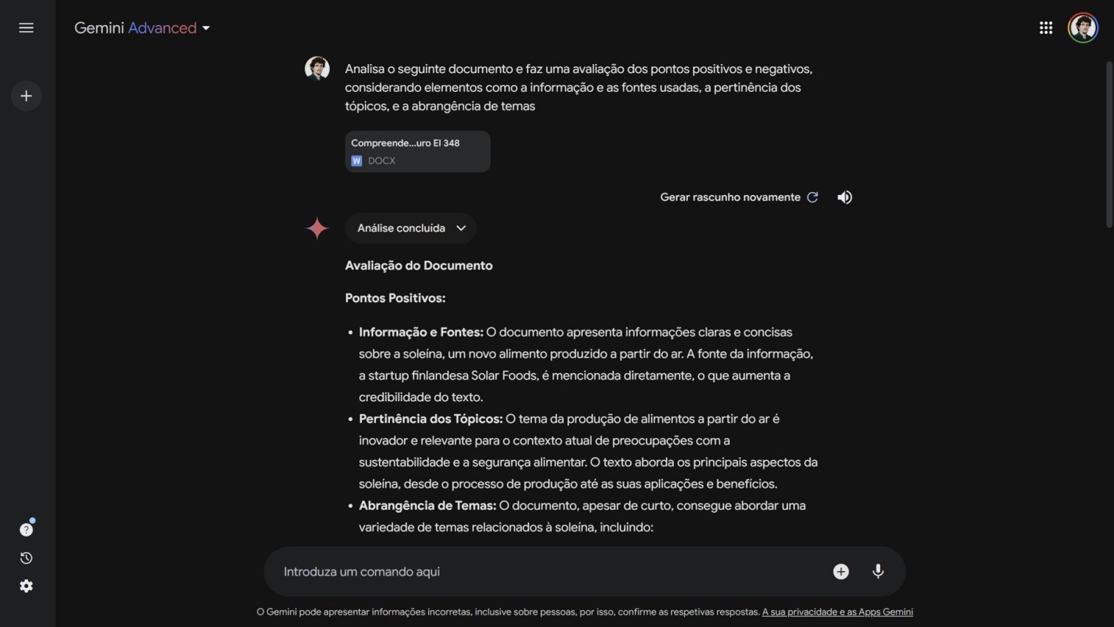 Uma das formas mais úteis de usar os assistentes de IA é como ferramenta de apoio à revisão de textos. Imagine que tem um trabalho para entregar até ao final da semana. Assim que tiver o documento final, pode carregá-lo no ChatGPT ou Gemini e pedir uma análise ao texto. Como já dissemos noutras edições, quanto mais detalhada for a instrução (prompt) dada ao assistente, mais completa vai ser a ação. No caso da revisão de textos, pode usar a seguinte instrução como ponto de partida. “Analisa o seguinte documento/texto e identifica os erros de ortografia, pontuação, acentuação, sintaxe e concordância. Faz também sugestões de correção para os problemas encontrados“. É também possível fazer pedidos mais específicos, como “Sugere formas para melhorar a clareza desta frase” ou definir o tom do texto através de instruções como “Faz sugestões para tornar este parágrafo mais assertivo, considerando que o tema do trabalho é [inserir tema]” caso queira atribuir uma maior seriedade e credibilidade a um texto.