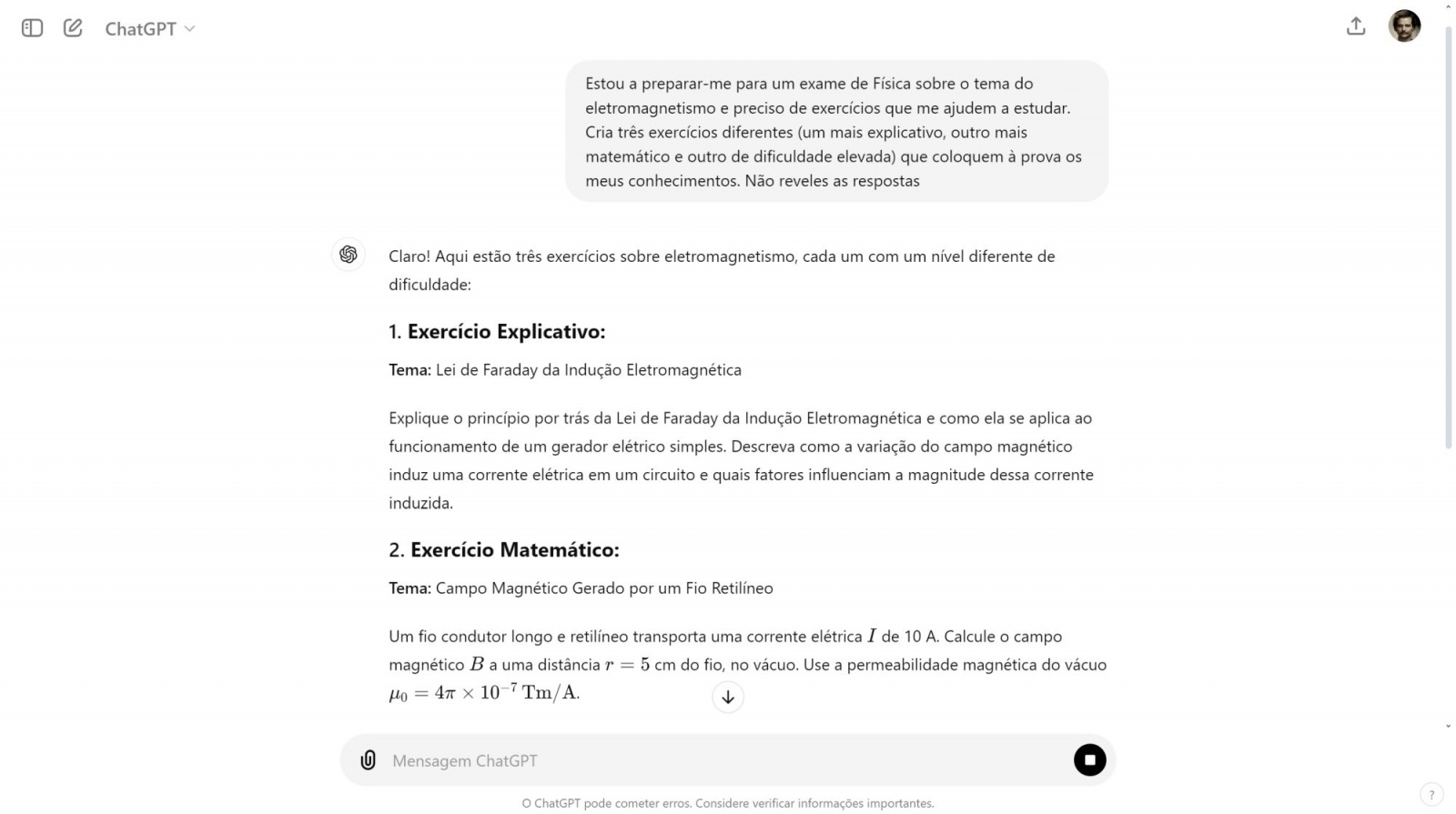 Esta dica não substitui os livros dedicados aos programas curriculares e que são um complemento aos planos de estudo dos estudantes. Mas a grande vantagem de usar um sistema de IA na preparação é poder ajustá-lo àquelas que são as suas necessidades específicas. Vamos imaginar que dentro de uma disciplina (Física, por exemplo) tem dificuldade com o tema do eletromagnetimo. Pode pedir exercícios específicos sobre o tema e indicar a sua tipologia, dificuldade, entre outros parâmetros. “Estou a preparar-me para um exame de Física sobre o tema do eletromagnetismo e preciso de exercícios que me ajudem a estudar. Cria três exercícios diferentes (um mais explicativo, outro mais matemático e outro de dificuldade elevada) que coloquem à prova os meus conhecimentos. Não reveles as respostas”, a título de exemplo.