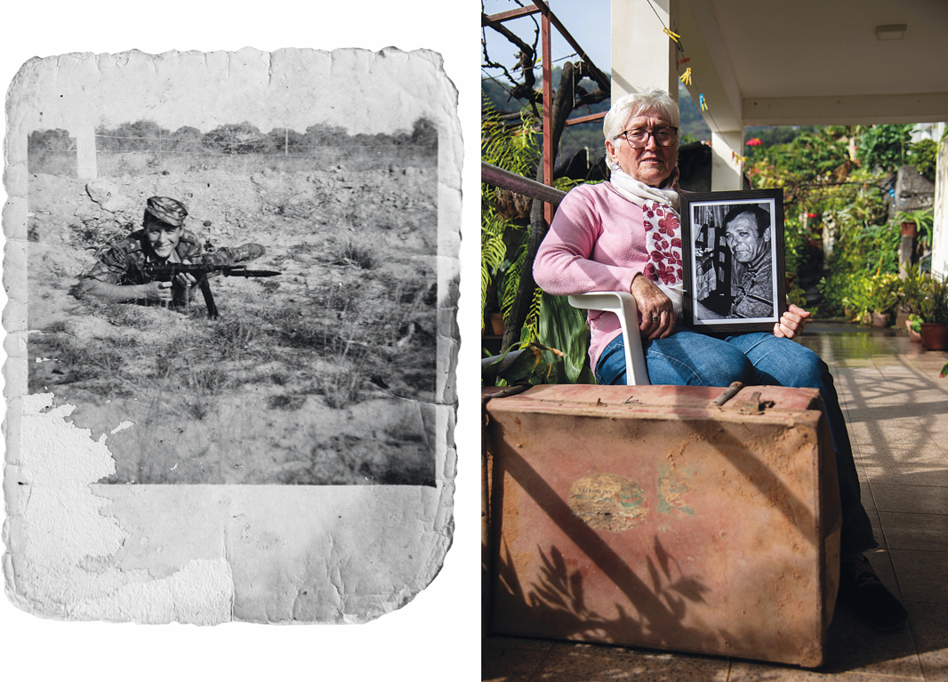 Maria Augusta de Freitas Andrade, viúva de Francisco Assis Teixeira (1941-1998), posa com a foto do seu marido e a mala que viajou com ele até Angola. “Contava que, nas horas vagas, fazia os caixões de tábuas para os colegas que morriam. E dizia que o que lhe valia eram as cartas da família ou das madrinhas de guerra, que lhe traziam consolo.”