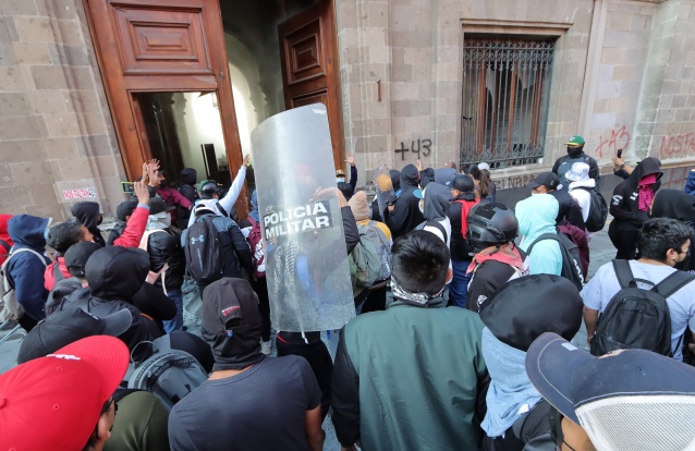 Várias dezenas de pessoas que se manifestavam contra o desaparecimento em 2014 de 43 estudantes de uma escola para professores primários da localidade de Ayotzinapa, sudoeste do México, derrubaram hoje as portas do palácio presidencial na capital do país
