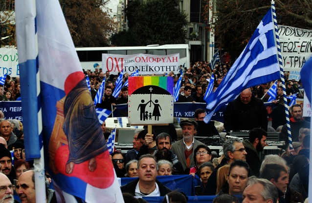 Milhares de pessoas manifestaram-se hoje em Atenas para protestar contra o projeto de lei apresentado pelo governo conservador, que legaliza o casamento homossexual no país, mostrando cartazes contra a união legal de duas pessoas do mesmo sexo