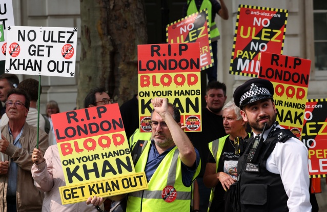 Algumas centenas de pessoas manifestaram-se hoje em frente à residência do primeiro-ministro britânico, em Londres, em protesto contra o alargamento da área onde os veículos mais poluentes estão sujeitos a uma taxa diária