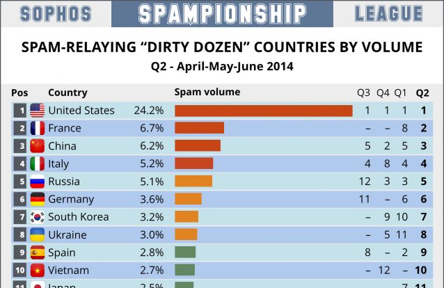 Surpreendentemente, os EUA surgem no topo de uma lista de países que mais spam enviam. O país lidera com uma margem considerável para o segundo, França, e o terceiro, China.