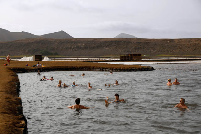 Não importa como lá se chega de pick up, mota, autocarro, carro alugado ou outro veículo, mas é imprescindível passar algum tempo nas salinas de Pedra de Lume, que deram nome à ilha. Antes de se passar no buraco que dá acesso à cratera do antigo vulcão (por €5), a vista lá de cima torna a experiência mais rica. Mas não é a paisagem que transforma esta visita num dia especial. Tomar aqui banho, isso sim, faz toda a diferença. Nos primeiros momentos tudo parece igual, mas de repente o corpo perde o peso e, como no Mar Morto, começa a flutuar, tornando-se impossível nadar. Enquanto se aguentar, o divertimento é encontrar uma posição cómoda, sem dar encontrões às outras pessoas. Mas depressa o sal nos olhos e na boca começa a incomodar, obrigando ao fim da brincadeira. Por €1, ganha-se um duche de água doce antes de se sair. Caso contrário, segue-se salgado o resto da viagem. Mas que isso não impeça de se reparar, ao longo do caminho, nas rudimentares estruturas de madeira, que serviram, no passado, para o transporte do sal.