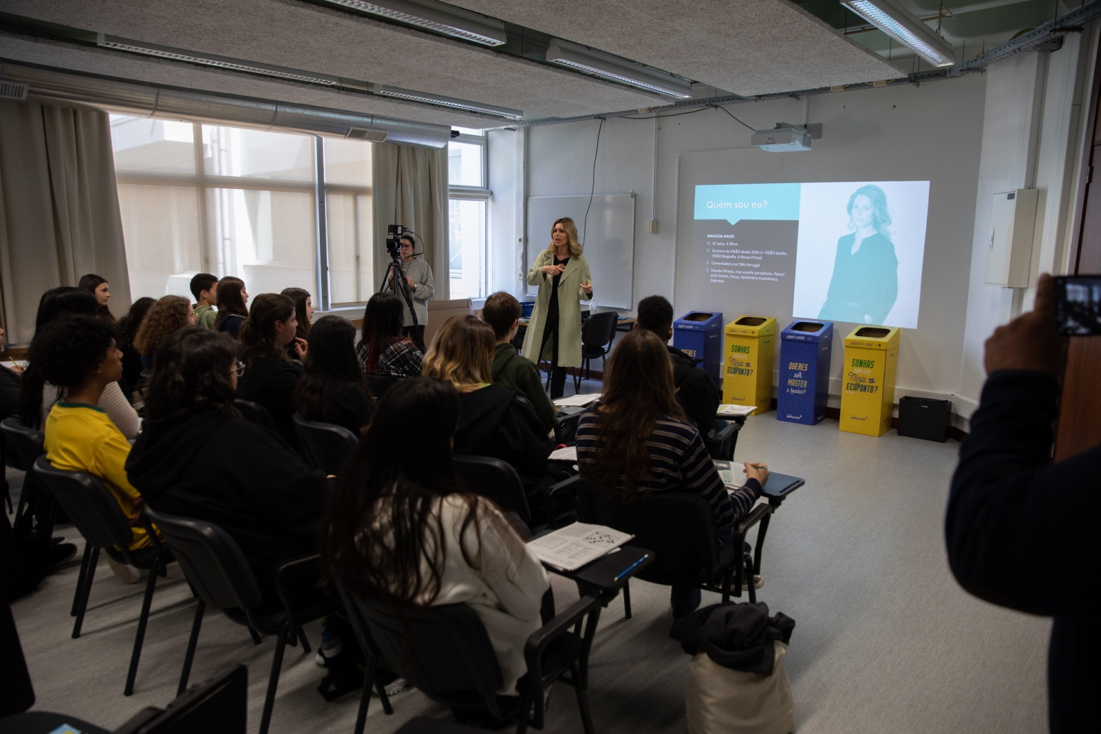 Foi ela a “professora” de serviço neste workshop de jornalismo lecionado à turma do 10ºH1, área de Humanidades, da Escola Eça de Queirós, nos Olivais, e transmitido em direto a dezenas de outras escolas pelo País. (Veja o vídeo aqui)