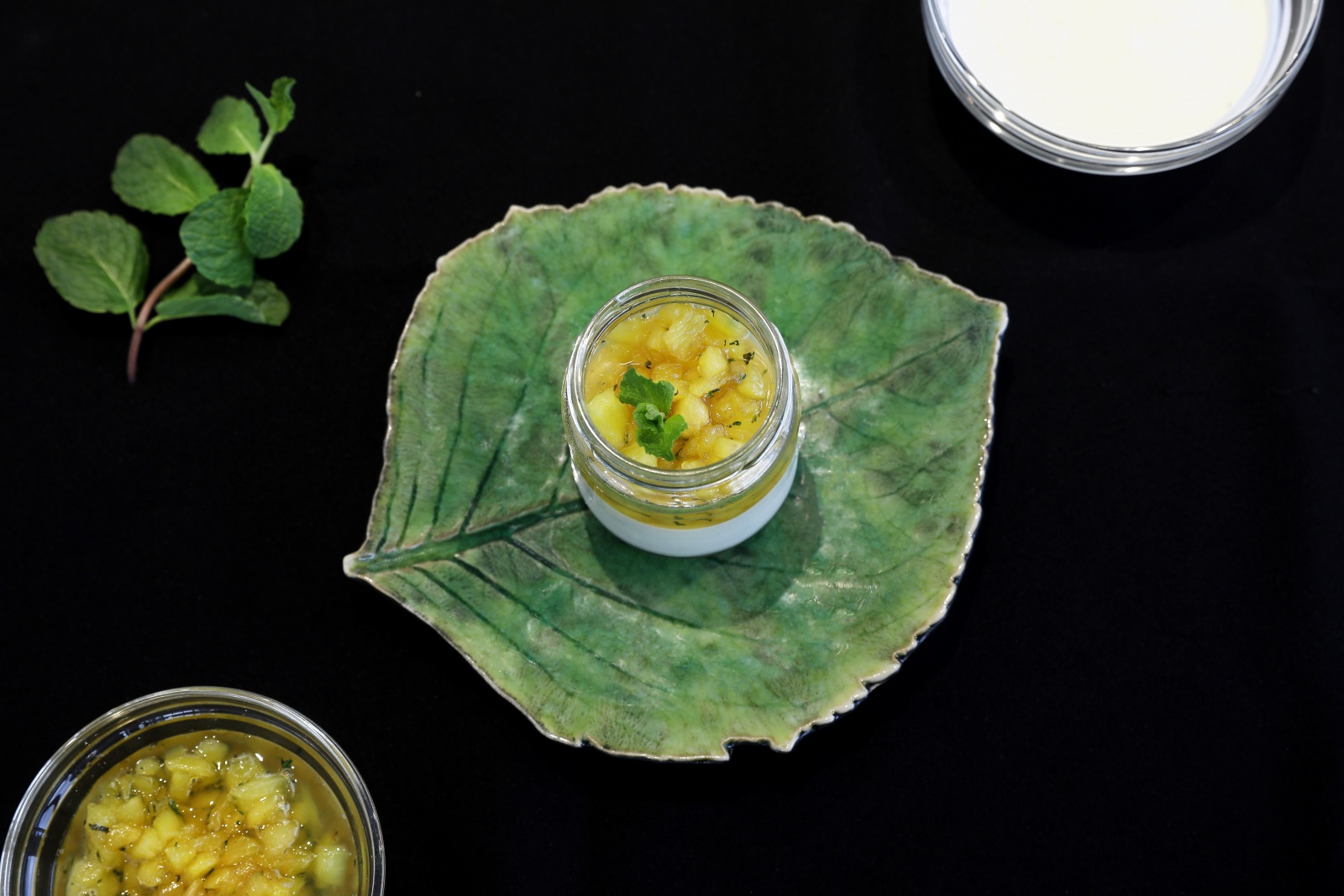 Leve o ananás, a geleia de arroz e a hortelã picada ao lume e mexa bem, até ferver. Depois, deixe arrefecer.