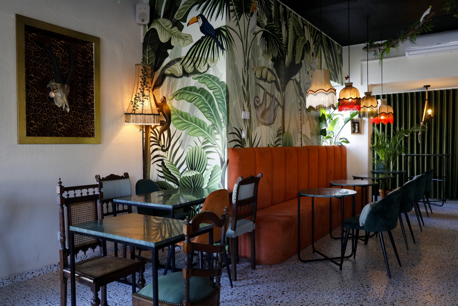 O ambiente puxa ao tropical e exótico – muito por causa do papel de parede com grandes folhagens verdes, pássaros pendurados na ramagem do teto –, com candeeiros de abat-jours de franjas, à meia-luz, a combinar com a música bem selecionada.