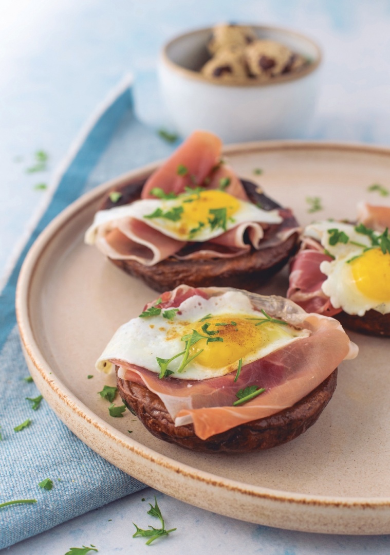 Coloque numa frigideira a manteiga, o alecrim, o alho e os portobellos. Deixe amolecer, tempere e coloque num prato. Coloque uma fatia de presunto em cada cogumelo e um ovo frito em manteiga. Polvilhe com cominhos e salsa fresca.