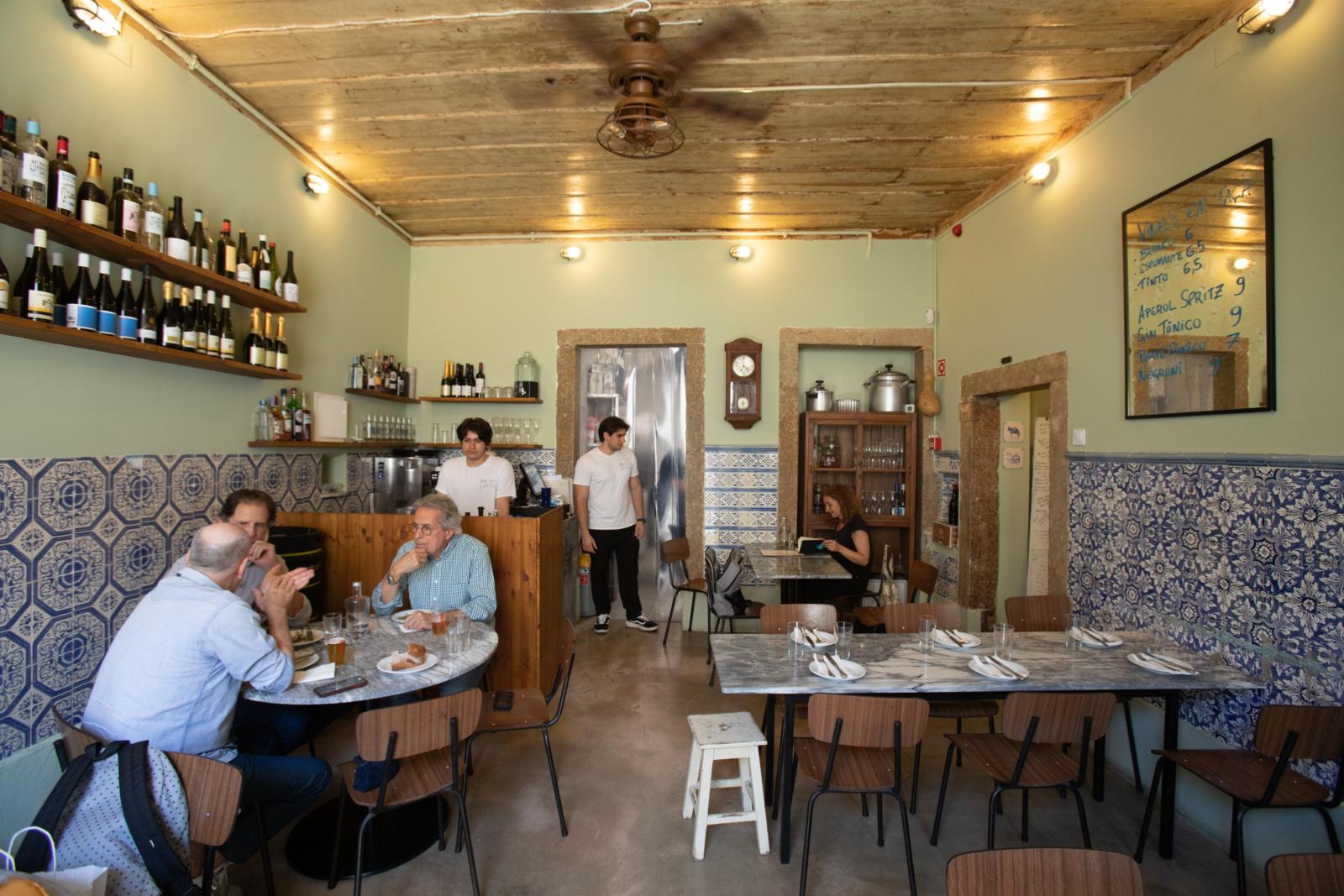 Do Floresta do Alcaide, mantiveram os azulejos, rasparam as camadas de tinta do teto e puseram mesas de tampo de mármore. O novo nome surgiu de uma circunstância: Taberna Meia Porta, uma vez que só abre uma das duas portas. Aqui, tudo é servido em travessas de alumínio para partilhar: croquetes de sapateira (€9, 3 unidades), ostras de vinagrete, chalota e toranja (€11, 4 unidades), moelas (€6), barriga de porco assada com grão-de-bico (€16), acompanhados por vinhos portugueses (a copo) e rematado por um arroz-doce gelado (€6). A média da refeição, calcula Fred, ronda os 25 a 30 euros. Uma novidade são os digestivos, da bagaceira à aguardente CR&F, do medronho ao moscatel, “para se conhecer as coisas boas de Portugal”.