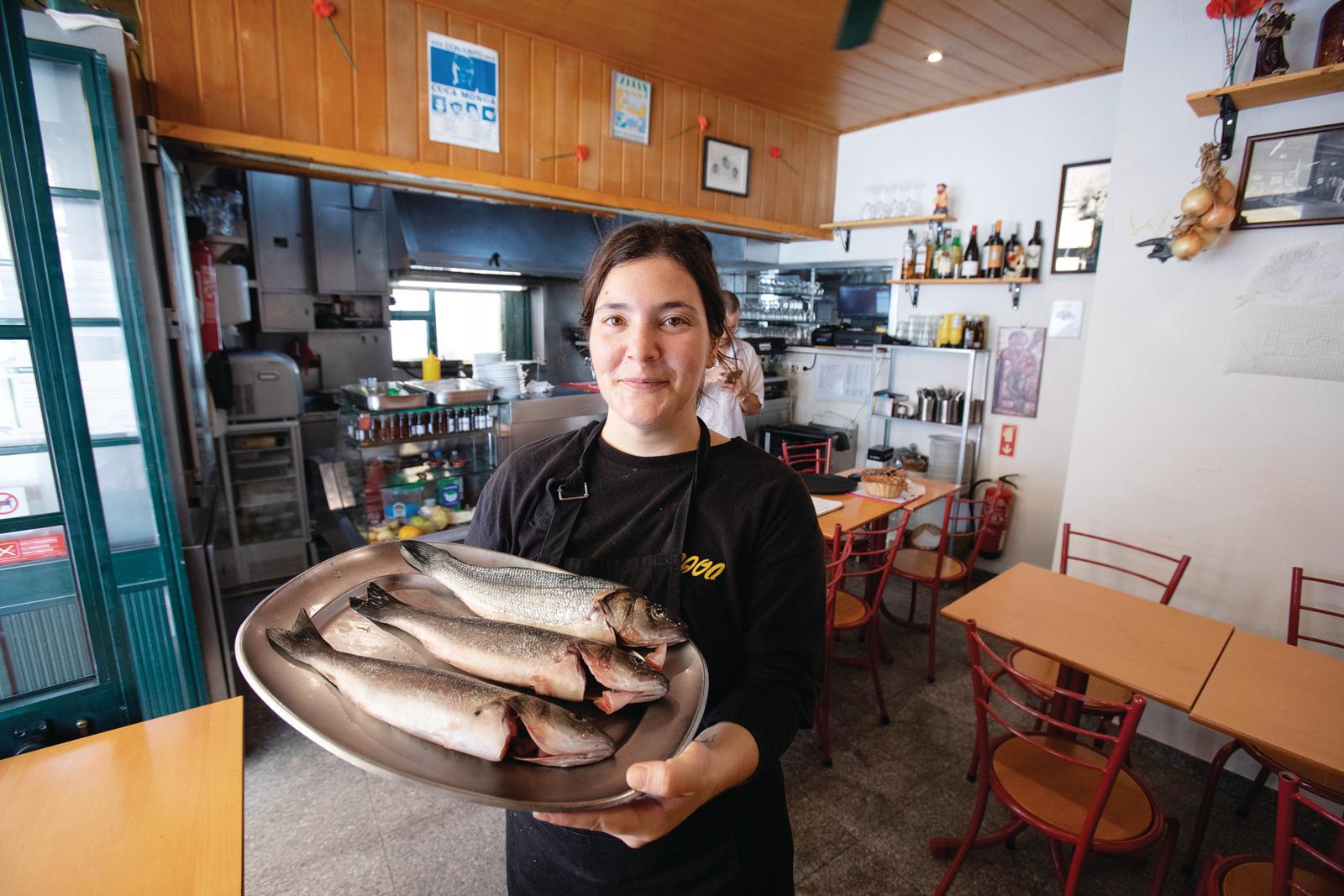 A ementa, “feita com carinho” pela equipa de quatro cozinheiros liderada por Anabela Pires, que já aqui trabalhava, tem sobretudo pratos de peixe. Sem pausas entre refeições, servem pataniscas (três exemplares generosos, €9), jaquinzinhos com arroz de tomate e salada, bacalhau à minhota, um prego de atum, 150 gramas de peixe braseado, com maionese japonesa e batatas de duas frituras (€18) e uma mousse de chocolate densa (€6), numa taça em inox de pé alto, com flor de sal fumada.