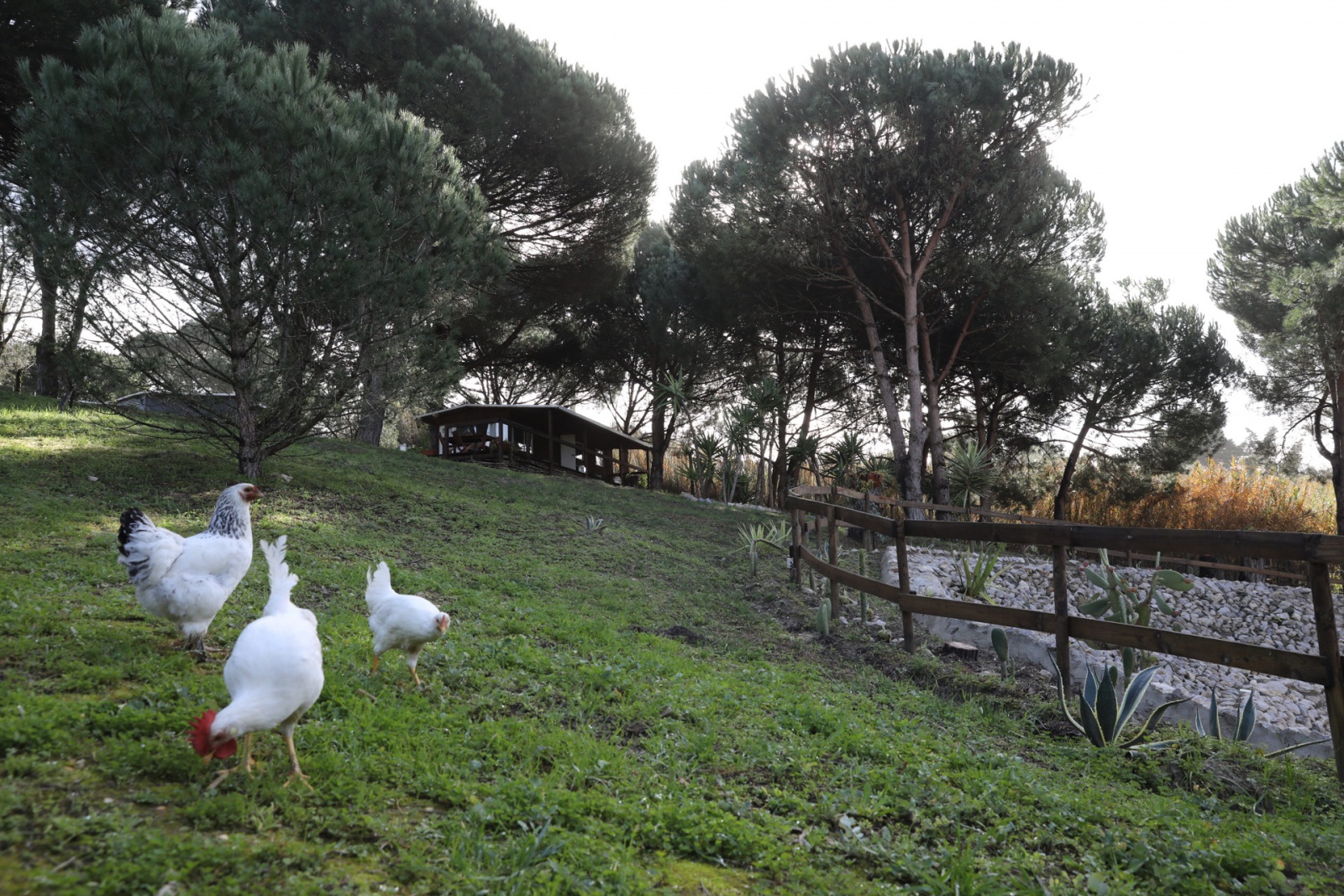 Quando chegamos, dá vontade de pousar as malas e percorrer, de imediato, os seis mil metros de espaços verdes, por entre pinheiros, árvores de frutos, uma horta muito bem tratada, baloiços em madeira e recantos que convidam à contemplação. A piscina, de água salgada aquecida, fica mesmo bem integrada no terreno. Há quatro casas à escolha, todas diferentes: a Lisboa e Porto dão para duas pessoas, a África acomoda até cinco hóspedes e a Madeira, que parece estar suspensa nas árvores, chega para uma família de quatro, porque se trata de um open space com uma cama de casal e um sofá cama. Todas permitem que se cozinhe e estão muito bem equipadas para esse fim.