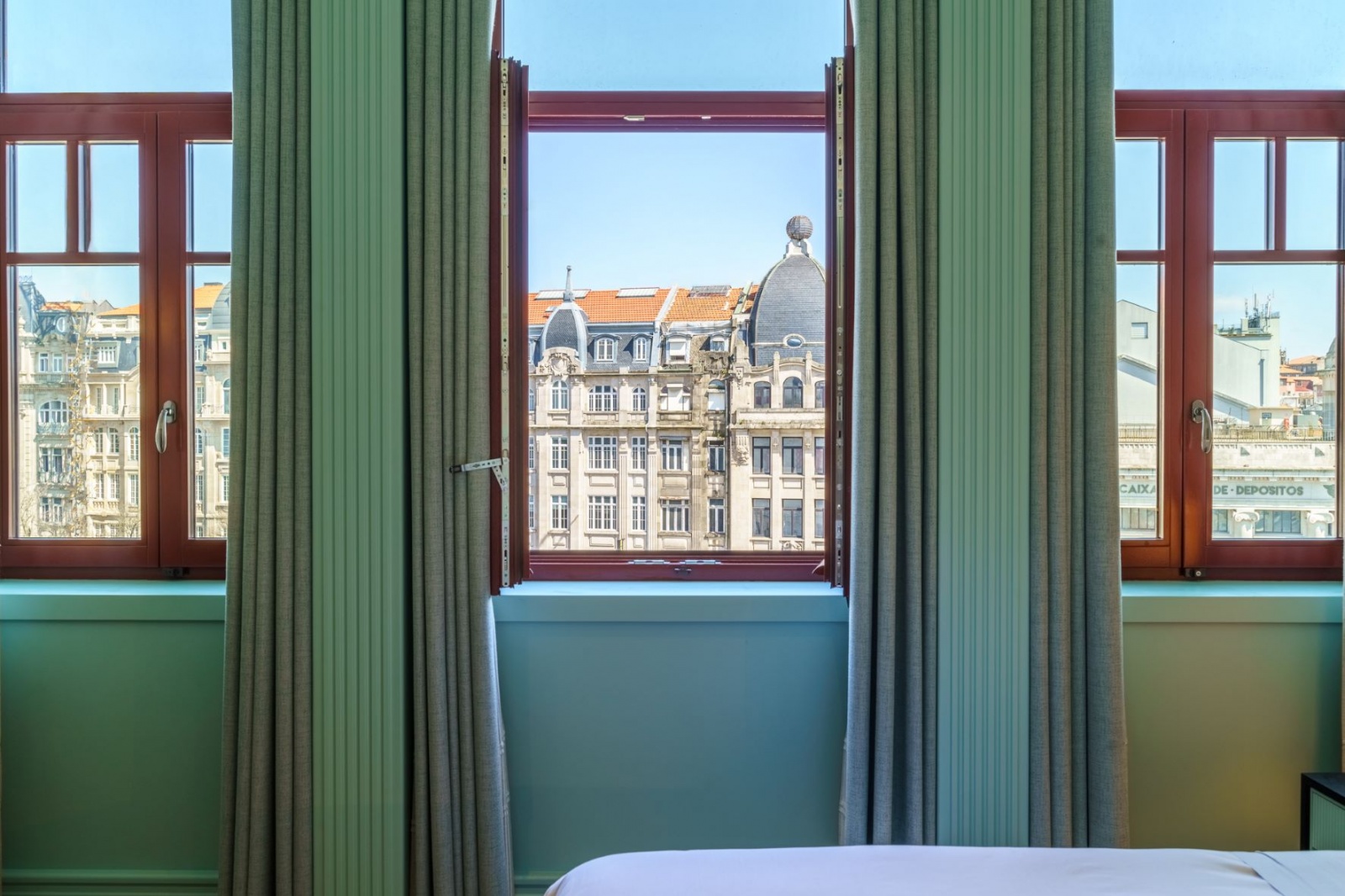 Divididos em oito categorias (dos cosies às suítes), os 68 quartos ocupam os seis pisos de um e de outro edifício: uns oferecem janela ampla para a Avenida dos Aliados, outros têm vista para o pátio interior, onde se encontra uma piscina aquecida; os restantes dão para a Rua do Almada.
